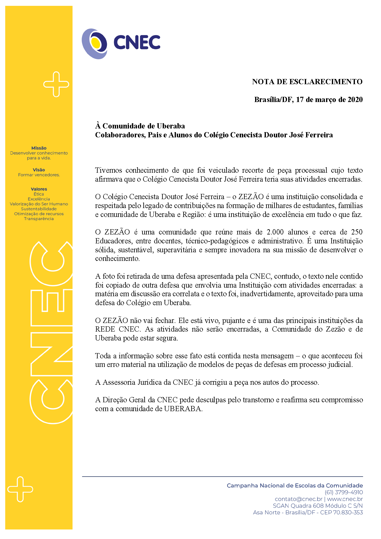 Nota de esclarecimento sobre veiculação de peça processual que trata do "encerramento das atividades" do Colégio Cenecista Dr. José Ferreira.