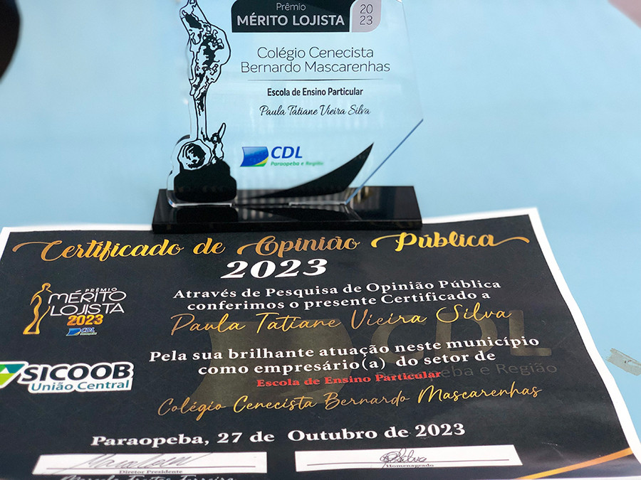 Colégio Cenecista Bernardo Mascarenhas recebe o Prêmio Mérito Lojista 2023 como referência na categoria Escola de Ensino Particular.