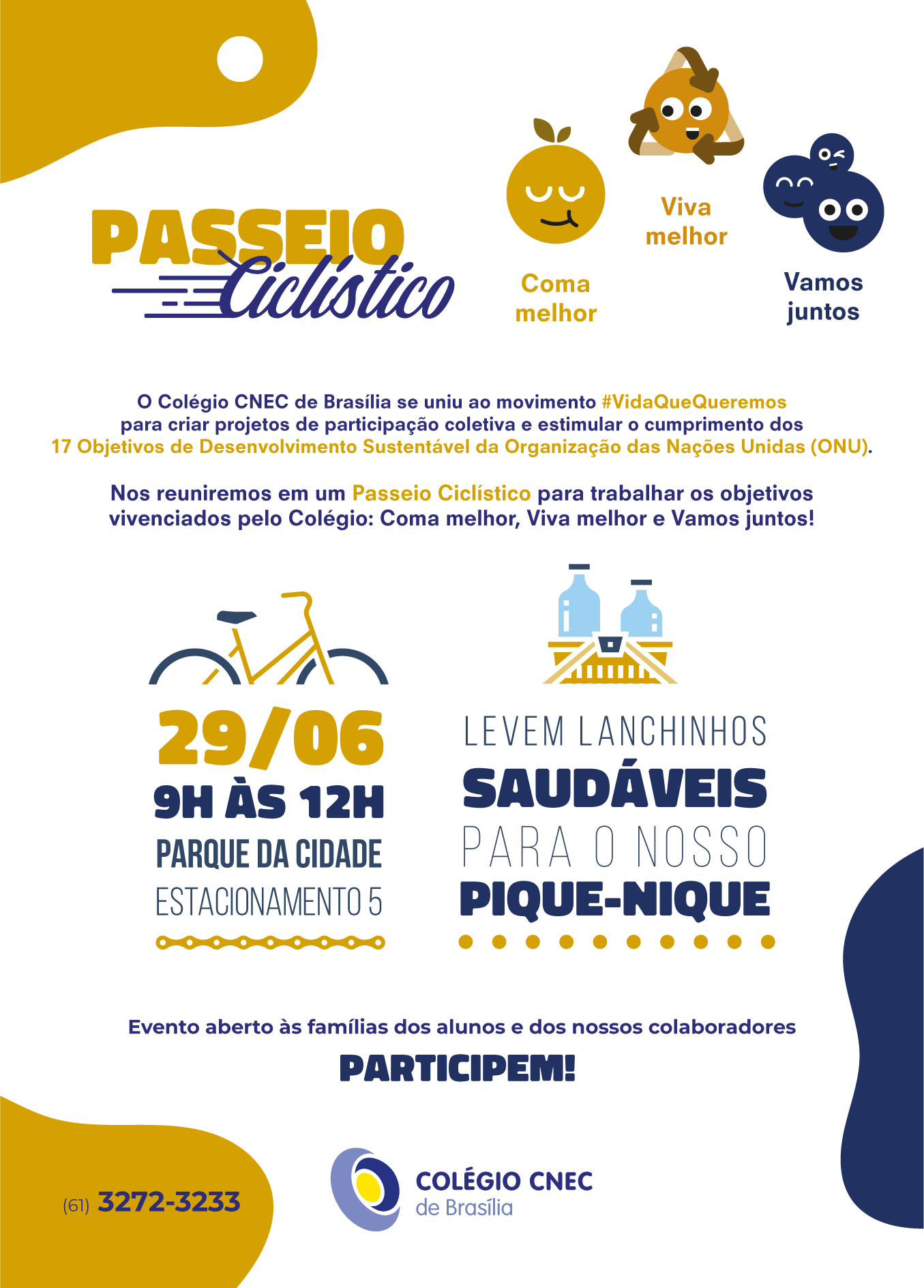 No próximo sábado (29), o colégio CNEC irá realizar um passeio ciclístico com toda a comunidade das 9h às 12h, no Parque da Cidade. E ao final, será feito um “pique-nique” sob a sombra das árvores.