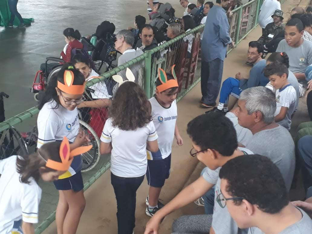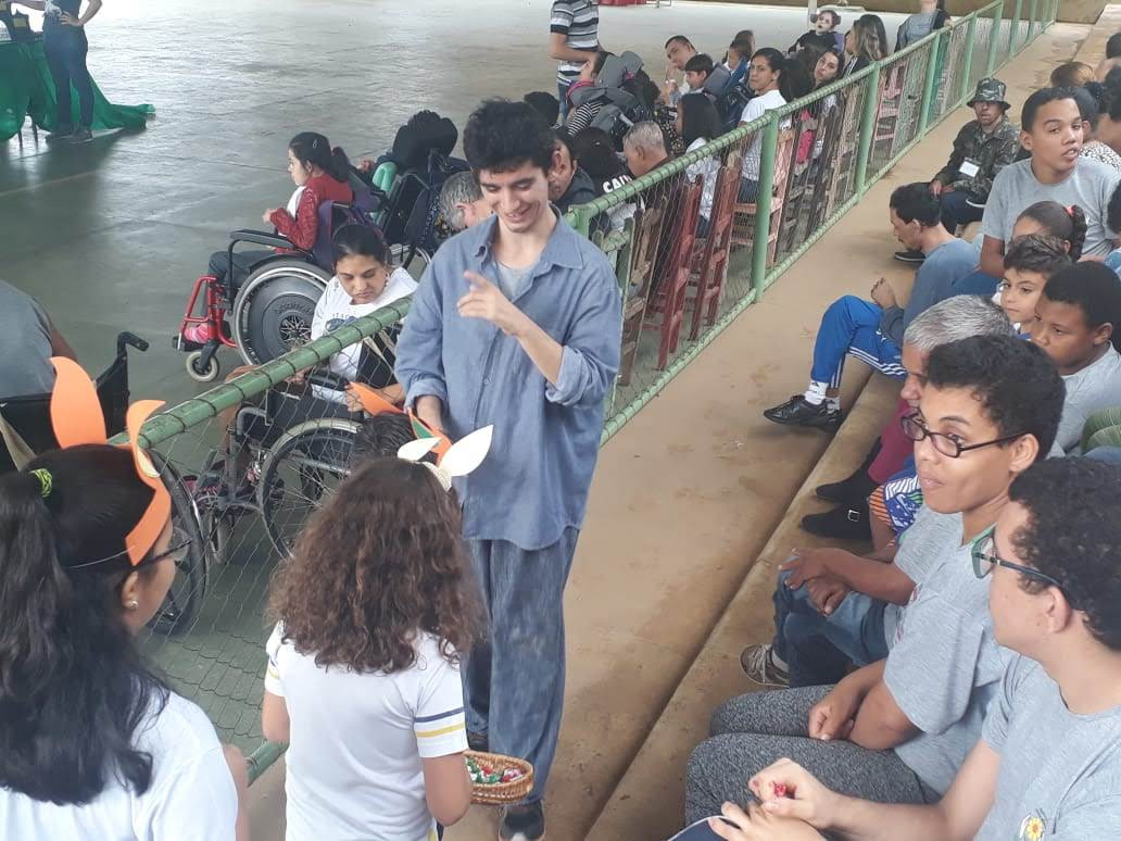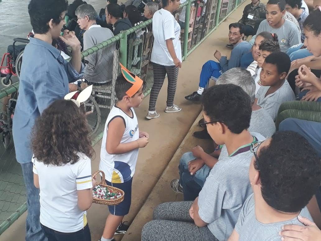 Nossos alunos sorteados entregando os leites que estão sendo arrecadados para a APAE.
