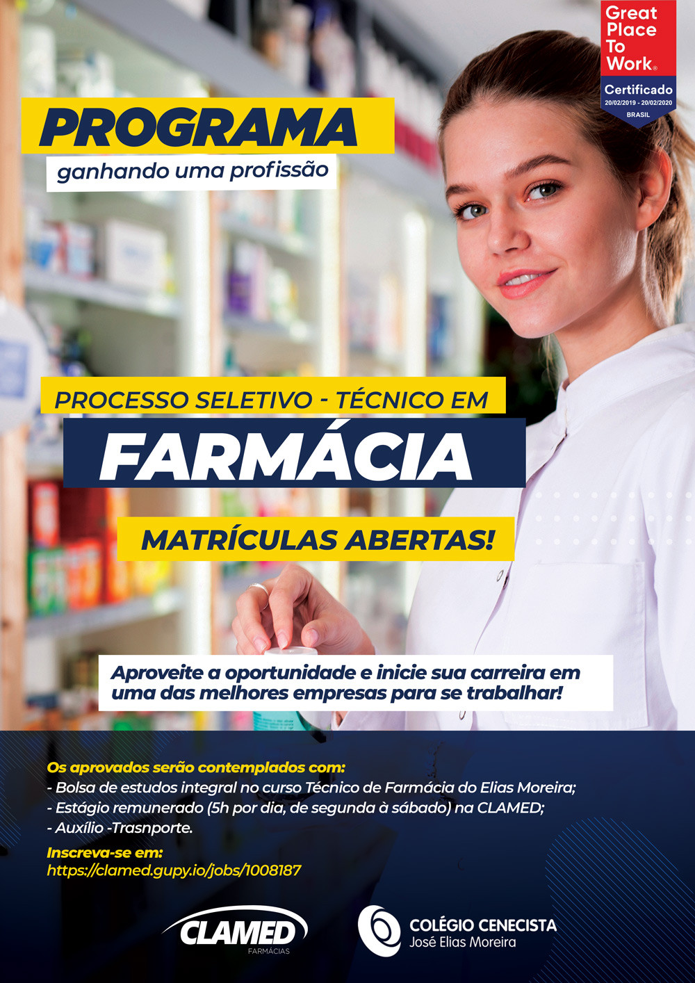 A rede de farmácias Clamed, em parceria com o Colégio Cenecista José Elias Moreira, está com processo seletivo de bolsas de estudo integral para o Curso Técnico em Farmácia, na instituição, e mais estágio remunerado, na rede farmacêutica.