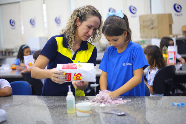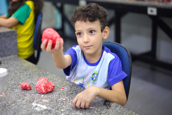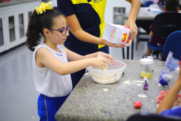 Os pequenos trouxeram os materiais para a produção da própria massinha, que consistiram em farinha de trigo, sal, água, óleo e corante alimentício da cor preferida de cada um.
