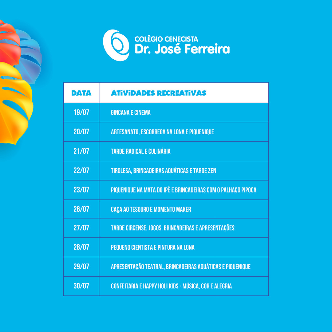 O Colégio Cenecista Dr. José Ferreira está a todo vapor e com programação para que as férias dos nossos alunos tenham diversão garantida. Para alegria das nossas crianças foi organizado uma série de atividades recreativas que serão realizadas neste período de descanso, com direito a passeio e piquenique nas proximidades do Colégio e em contato com a natureza.