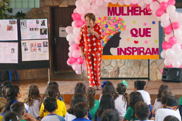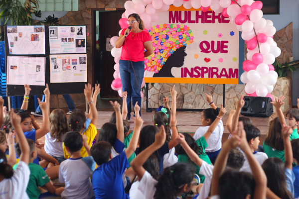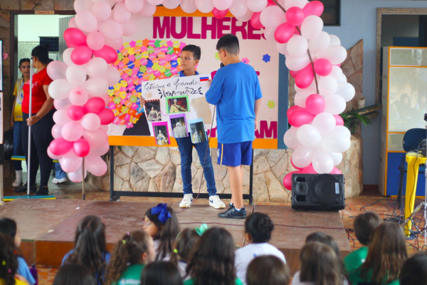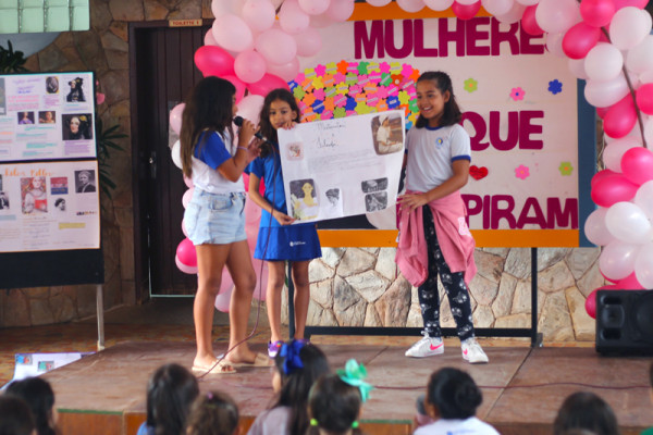 No evento, as crianças expuseram cartazes e falaram brevemente sobre a vida de algumas mulheres que trilharam importantes caminhos na nossa história, como Michelle Obama e a rainha da Rússia Catarina, a Grande.