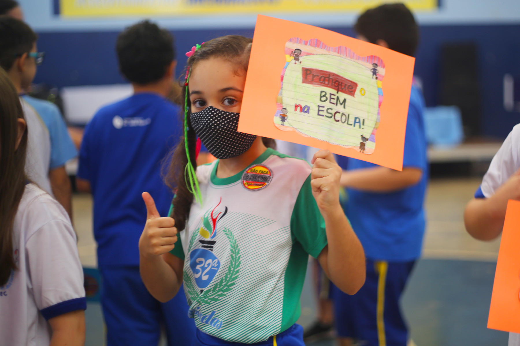 Os pequenos estudantes também levaram placas de autoria própria com frases de combate ao bullying e à violência escolar, demonstrando toda a necessidade e o apelo por soluções deste problema que deve ser cada vez menos presente em seu crescimento.
