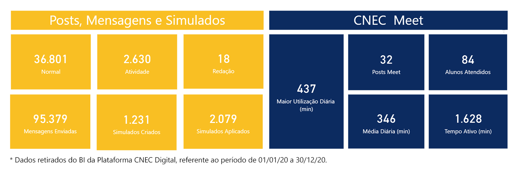 Hoje viemos compartilhar alguns números da nossa plataforma. Eles refletem o esforço e o empenho dos nossos professores, coordenadores, diretor e dos nossos alunos. Até o dia 30 de dezembro, nossa plataforma de aprendizagem já contava com mais de 36 mil posts, 2.630 mil atividades postadas e mais de 2 mil simulados aplicados durante o ano letivo de 2020. Além disso, foram um total de 39.481 postagens e mais de 95 mil mensagens enviadas por meio da CNEC Digital.