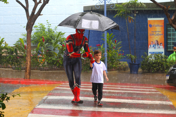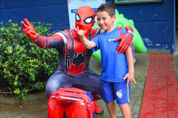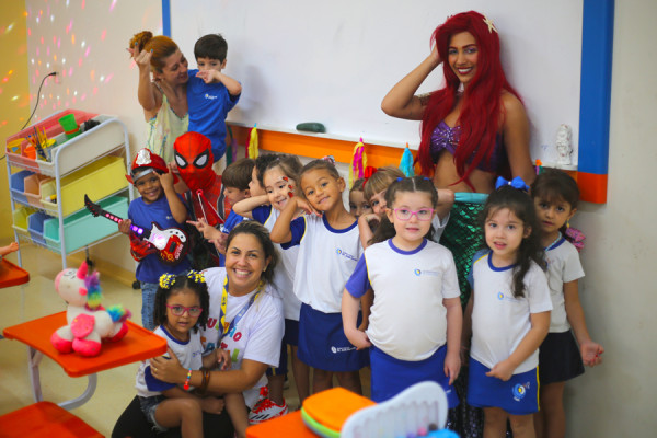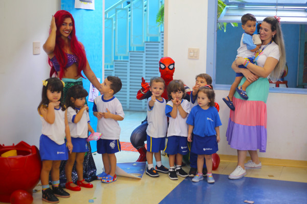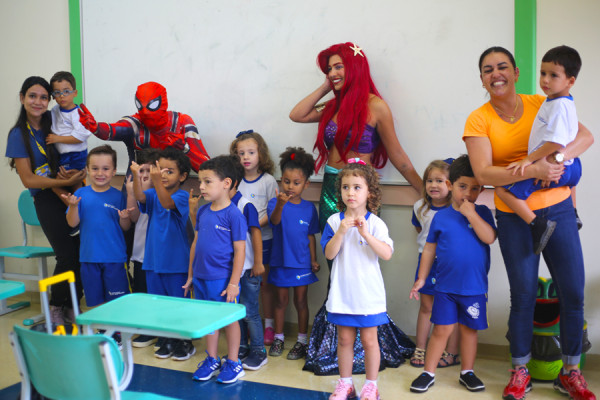 Os pequenos da Educação Infantil e do Ensino Fundamental I foram recepcionados pelas visitas especiais do Homem-Aranha e da Princesa Ariel. Os personagens fizeram olhinhos brilharem de encantamento e distribuíram abraços e palavras de bom retorno.