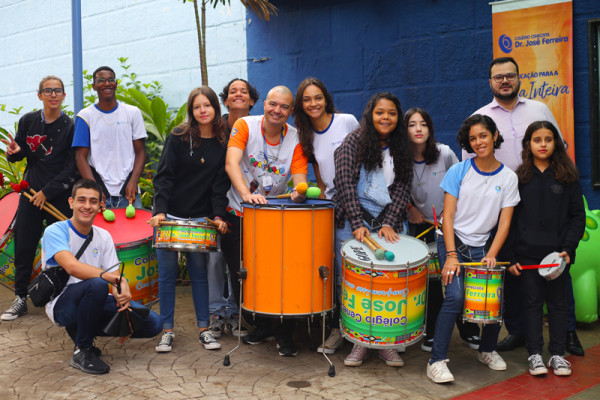 Os alunos do Ensino Médio também retomaram as atividades com a presença e energia do Núcleo de Bateria e Percussão do Zezão, que realizou uma apresentação animada antes do início das primeiras aulas. No período da tarde, as turmas do Ensino Fundamental II também foram acolhidas pelos personagens e pela coordenação.