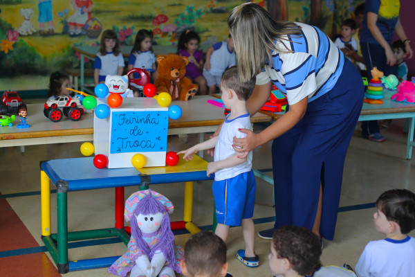 Na Feirinha da Troca, cada criança trouxe um brinquedo que usa pouco para trocar com os colegas, estimulando, assim, o consumo consciente e a reutilização dos nossos bens materiais.