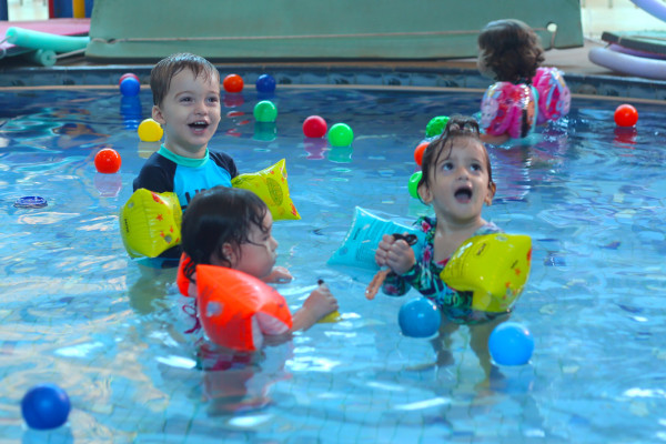 As piscinas do Colégio não poderiam ficar de fora. Os alunos colocaram suas roupas de banho, suas boias e outros equipamentos de segurança e caíram na água.