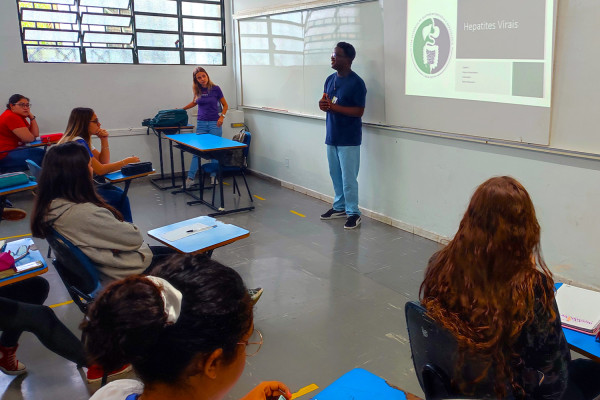 Alunos do curso de medicina que integram a Liga Acadêmica de Gastroenterologia e Hepatologia oferecem palestra para Ensino Médio.