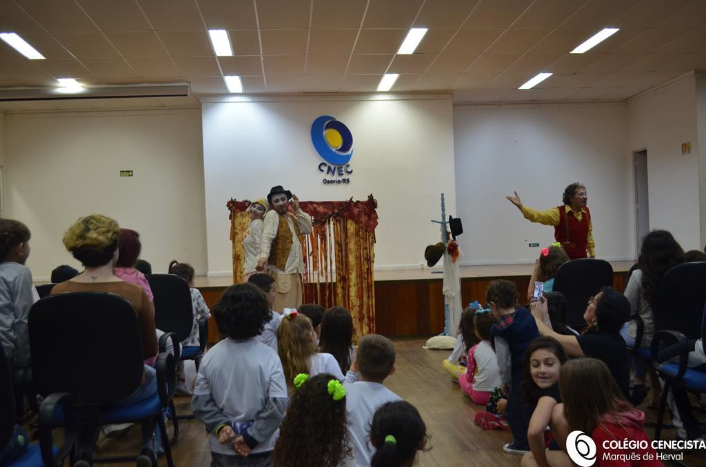 Os alunos das turmas da Educação Infantil ao 5º ano participaram iniciaram a Noite do Pijama com uma peça de teatro “Coco verde e Melancia” que retrata a história de amor de duas pessoas de uma cidade pequena que enfrenta as mentiras da família para ficarem juntos. A peça foi apresentada pelo grupo teatral Crakety - Teatro de Palco e Bonecos.