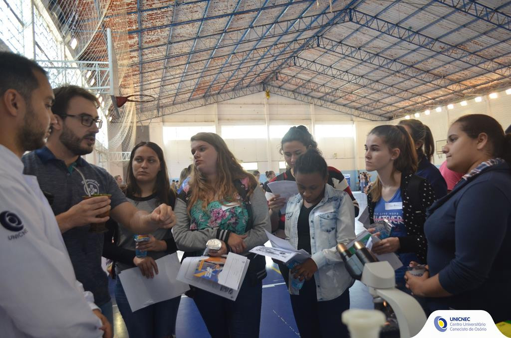 Logo, os alunos foram direcionados ao Ginásio de Esportes da UNICNEC, onde puderam visitar os estandes dos cursos ofertados, para conversar com coordenadores, professores e acadêmicos sobre suas áreas de interesse. Em seguida, os alunos, divididos em grupos, realizaram um tour guiado pela instituição, em que puderam ver mais de perto a estrutura dos cursos.