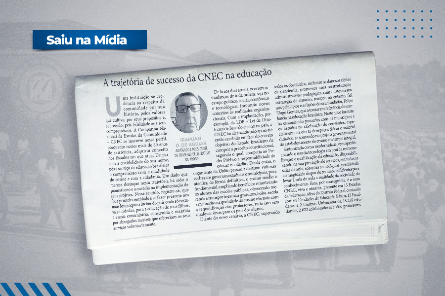 O jornal O Estado, do Ceará, publicou o artigo "A Trajetória de Sucesso da CNEC na Educação", de autoria de Irapuan Diniz de Aguiar, advogado, professor e membro do Conselho Nacional da Campanha Nacional de Escolas da Comunidade (CNEC). O texto apresenta a história da instituição, suas conquistas e o impacto no cenário educacional do Brasil.