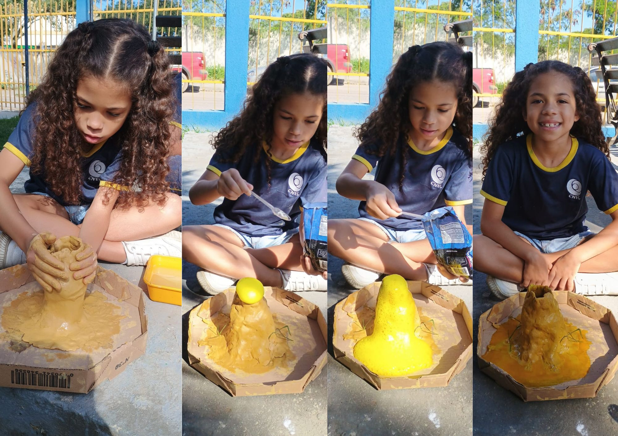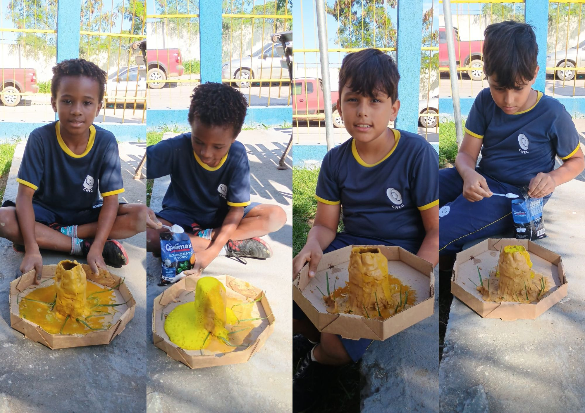 Os pequenos cientistas do 3º e 4º ano levaram a aprendizagem para o jardim da escola e fizeram um verdadeiro espetáculo com vulcões em miniatura! Com a mistura de bicarbonato e vinagre, observaram na prática uma reação química cheia de espuma e emoção. 🔬🌿