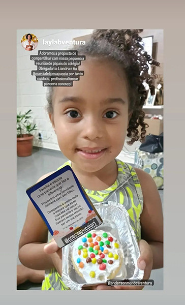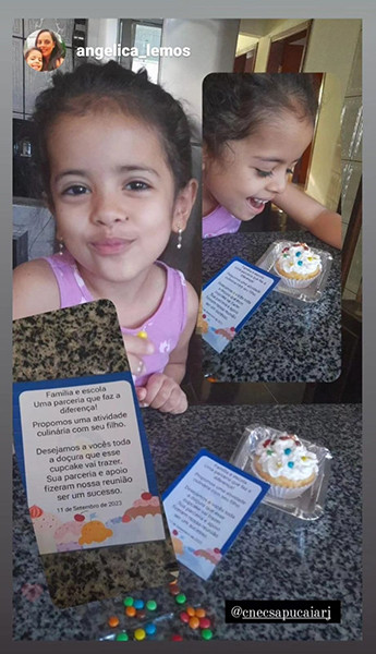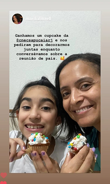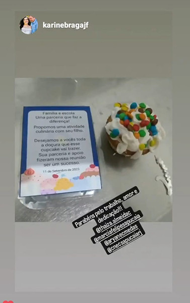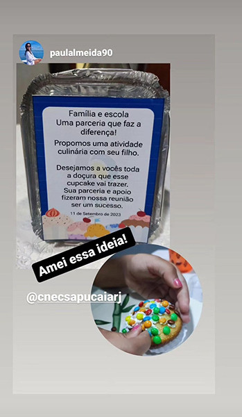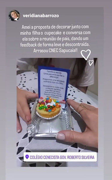 Ao final das reuniões, os pais foram surpreendidos com uma delicada caixinha contendo um cupcake e acessórios para decoração. A proposta era mais do que um simples agrado: os responsáveis foram convidados a chegar em casa, se reunir com seus filhos e juntos decorar o cupcake.